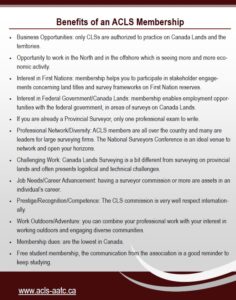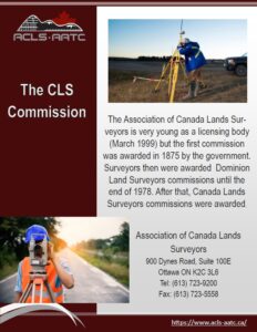 The Association of Canada Lands Surveyors (ACLS) is the national licensing body for professionals surveying in the three Canadian territories, in the Federal parks, on Aboriginal reserves, on and under the surface of Canada’s oceans. The exclusive title attributed to these professionals is that of Canada Lands Surveyor (CLS).